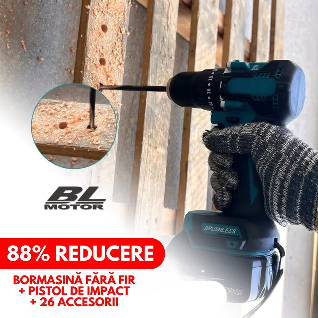 KIT ORIGINAL: BORMASINĂ CU ACUMULATOR + CHEIE DE IMPACT + 26 DE ACCESORII + 2 BATERII (Cópia)
